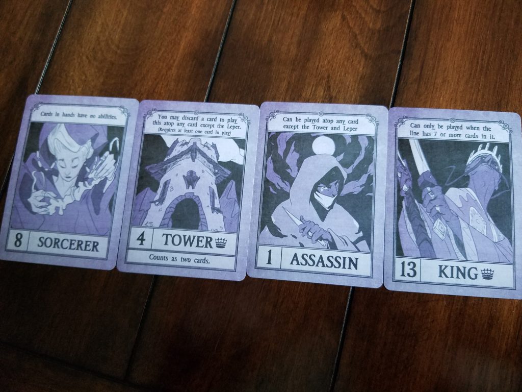 It’s being marketed as an abstract game, but I don’t necessarily see how it’s more abstract than most microgames. I mean, there’s an assassin that kills people, an imposter who imitates them, and the knight kills the dragon. That’s at least marginally thematic. Regardless, it’s a perfect information 2 player game with lots of sitting in silent contemplation, so it’s got that going for it.
