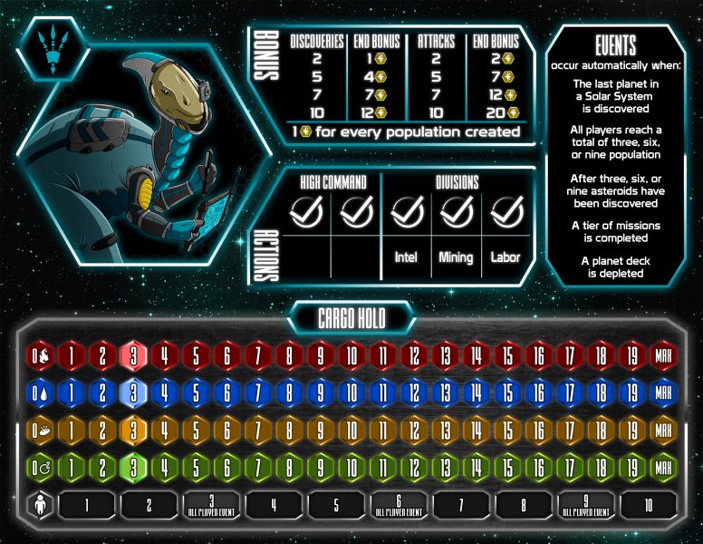The divisions are similarly interesting, but frustrating. Intelligence allows you to complete a “mission”, though that’s not as exciting as it sounds. Each mission is just a card that specifies which resources you spend, what resources you get back, and how many points the mission is worth. As the game progresses more powerful missions are unlocked, but there’s still not really anything to it–just statistics. Usually there’s not much trouble getting a mission accomplished each round, partially due to how many resources are available through asteroids.