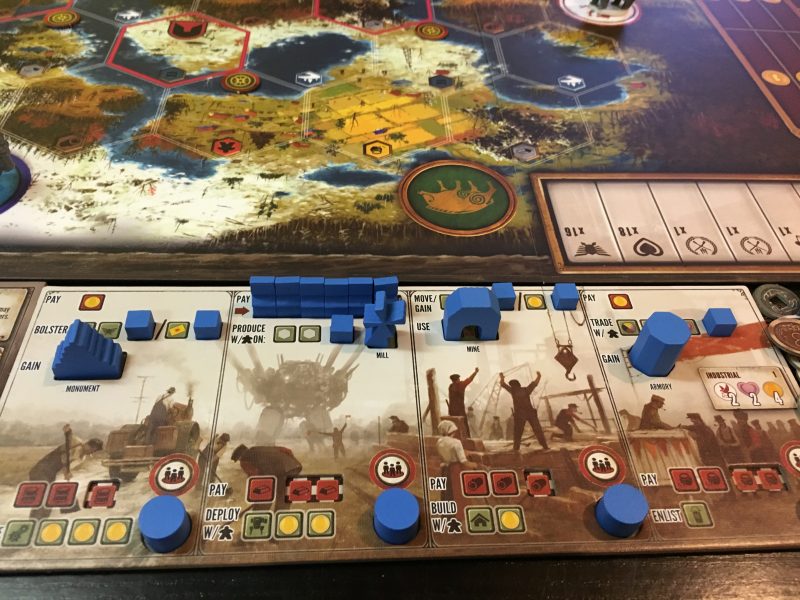 Players each take a faction mat, which gives them a special power, and a player mat, which is also unique (they have all of the same actions, just in different orders and with different costs). The faction mat is where the mechs sit until they’re deployed, but the player mat is where the real action happens. It is split into four segments. Each segment has a top row action and a bottom row action. On your turn you’ll place a pawn in one of those segments and take either one or both of the actions in it.