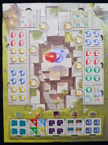 The game is short with what 9-10 rounds. The predefined length of game is very short. Just about the time your engine starts moving the game ends. I’d prefer another win condition that isnt fixed like 1st to a VP number or once x number of cards or market items are gone. It becomes a few strategies and if you make a less optimal choice possible by not affording a thing a few times you lose. I’ve seen people do well without hammer or chest. Just plan to say only buy maybe 1-2 gold faces and immediately start buying cards from the rest of faces becoming moon/fire or combo. End of game only barely over flowed gold but did avoid the 12 costs.